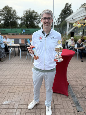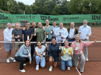 Ein bisschen Wehmut weht über unsere Tennisanlage, wenn es im Herbst wieder stürmischer, regnerischer und früher dunkler wird. Das Spielen auf Sandplatz ist für die meisten von uns doch am schönsten. Laufen und bewegen an der frischen Luft, gemeinsam mit Gleichgesinnten den Schläger schwingen, bestmöglich die Sonne genießen. Aber damit ist für 2025 demnächst Schluss. Eingeläutet wird der Übergang vom Sandplatz in die Tennishalle alljährlich mit unserem Sommerfest. Dann blicken die Vorstandsmitglieder nochmal auf den Sommer zurück, ziehen eine sportliche und wirtschaftliche Bilanz und präsentieren kommende neue Events, u.a. das Oktoberfest am 30. Oktober. Viel wichtiger noch: Es wurde wieder gemeinsam gegrillt, getrunken und vereinzelt sogar getanzt. Und wie jedes Jahr auch gefeiert. Verbunden wurde das Sommerfest mit dem Finaltag der Clubmeisterschaften in verschiedenen Wettbewerben. Da liefen bei nochmals sommerlichen Temperaturen teils spannende Mixed-, Doppel- und Einzelspiele. Mit der Siegerehrung aller Beteiligten wurde das Fest nochmal richtig rund bei der launigen Pokalübergabe. In der Königsdisziplin der Einzelkonkurrenz der Herren konnte sich Patrick Bührsch erneut die Siegerkrone aufsetzen. Die Doppelkonkurrenz haben Frank Petermann und Matthias Busch dominiert und in der Mixed-Kategorie haben Franziska Wittrin und Hendrik Wittrock den Pokal geholt. Ein Mitglied darf hier nicht unerwähnt bleiben, denn Jürgen Hansen hat ordentlich abgeräumt mit Tennisbällen, Weinflasche und Pokal, denn er triumphierte in allen Wettbewerben, auch wenn´s nur die B-Finals waren. Glückwünsche an alle Siegerinnen und Sieger und auf die Titelverteidigung 2026!