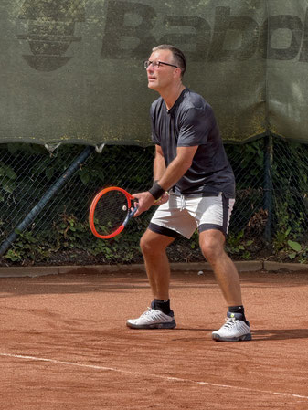 Eigentlich sind die Tempel Open neben dem Medifit-Cup unser zweites großes Ranglistenturnier auf unserer Anlage. In diesem Jahr aber sind wir bei den Tempel Open einen anderen Weg gegangen, haben das Turnier als LK-Turnier angepriesen und zwar nicht nur für Einzelkonkurrenzen, sondern auch für Doppel- und Mixedwettbewerbe. Vielleicht aufgrund der beginnenden Ferienzeit in Schleswig-Holstein sind dem Ruf nicht ganz so viele Tennisspieler*innen gefolgt, wie sonst. Auch die Wetterbedingungen standen unter keinem guten Stern. Dennoch hat die Turnierleitung entschieden, die Tempel Open auch 2025 stattfinden zu lassen. Herausragend an diesem Wochenende war der zweifache Sieg von Thommy Grüneberg, der damit ordentlich LK-Punkte sammeln konnte. Nicht ganz so erfolgreich vielleicht war Thomas Bretschneider (im Bild), der aufgrund der Zusammenlegung der 40er- mit der 30er-Konkurrenz Lehrgeld bezahlen musste. Zumindest konnte er gemeinsam mit Mella Grüneberg das Turnier gut über die Bühne bringen. Übrigens auch am Sonntag, obwohl die Mixed-Spiele in die Halle verlegt werden mussten. Am Start waren zwei Mixed-Doppel unseres Vereins. Dabei konnten Franziska Wittrin und Henrik Wittrock zwei starke Siege einfahren. Eines gegen die anderen Lokalmatadoren Manfred Grell und Anke Ihde erst im Match-Tiebreak mit 12:10.