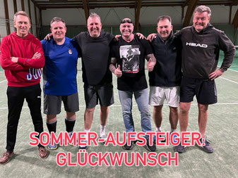 Äußerst erfolgreich war in der diesjährigen Sommersaison unsere erste 50-Mannschaft um Kapitän Jens Krause (2 v. l.). Sie haben in ihrer Staffel den Aufstieg geschafft, haben alle ihre vier Partien sehr souverän gewonnen: 8:0 Punkte, nur insgesamt acht Sätze abgegeben. Da können sich die Gegner in der K3-Staffel nächstes Jahr warm anziehen. Aber wenn man Martin Lange, Heiko Thomsen, Matthias Busch, Frank Petermann und Lars Staubermann in seiner Mannschaft hat, was soll dann anderes dabei herauskommen. Sportwart Grüneberg und der Verein sind stolz auf Euch. Herzlichen Glückwunsch!