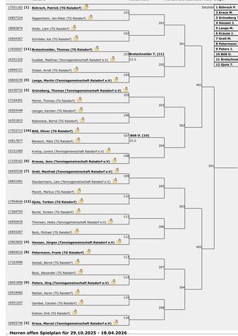 Alle Jahre wieder organisiert das Team um Heiko Thomsen und Thommy Grüneberg die internen Clubmeisterschaften - im Sommer auf Sand und im Winter in der Halle. Seit ein paar Tagen also sind die diesjährigen Hallen-Clubmeisterschaften gestartet - in den Kategorien Einzel, Doppel und auch Mixed. Dieser interne Wettkampf erfreut sich immer wieder großer Beteiligung. Das liegt vor allem an der Anzahl verschieden starker Spielerinnen und Spieler. Dass es in vielen Partien auch um Prestige geht, ist wohl auch klar. Bis zum April 2026 messen sich also viele Mitglieder, dann nämlich sollen die Finalspiele stattfinden. Aber bis dahin ist noch ein langer Weg. Erstmal wurden die Erstrunden-Partien ausgelost und einige haben sogar schon das Achtelfinale im Einzel erreicht. Favoriten sind Marcel Kraus (an zwei gesetzt) und Titelverteidiger Patrick Bührsch (topgesetzt). Im Doppel läuft es ein bisschen anders: Da wurden den 22 einzelnen Teilnehmern die jeweiligen Partner zugelost. Deshalb ist dort alles offen, Geheimfavorit könnte da das Duo Thorsten Bartel & Kai Schröder sein. Im Mixed-Wettbewerb gehen Titelverteidiger Franziska Wittrin & Hendrik Wittrock ins Rennen.